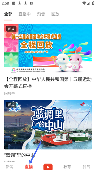 2、直播板塊有全運會開幕式回放、藍調里的中山等內容,用戶可及時觀看各類活動直播與回放。