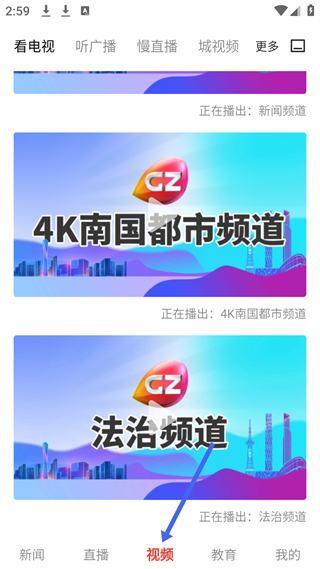 3、視頻板塊有看電視、聽廣播等分類,展示新聞、4K南國都市、法治頻道等,用戶可觀看各類電視節目。