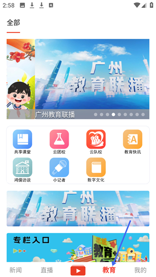 4、教育板塊有共享課堂、云團校等服務,展示廣州教育聯播,涵蓋豐富教育資訊與服務,助力用戶獲取教育信息。