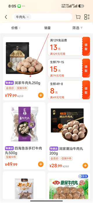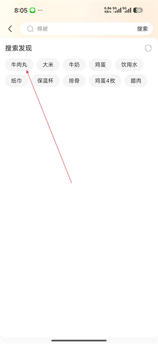 2、輸入關鍵詞并在搜索發現中選擇牛肉丸選項,進入對應商品列表頁面。