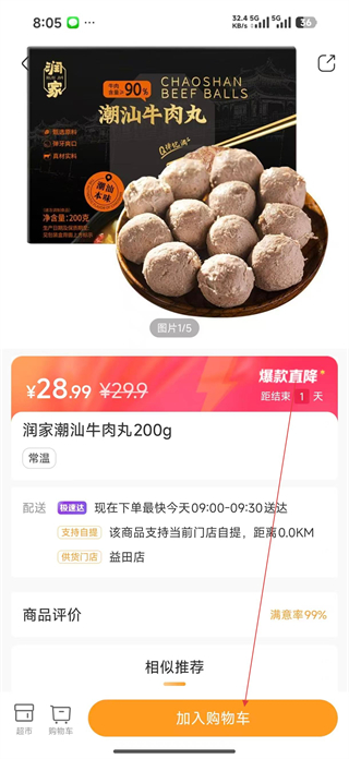 3、在牛肉丸商品列表中選擇潤家潮汕牛肉丸200g這一商品,點擊該商品,進入對應的詳情頁面。
