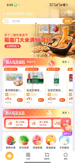1、打開軟件進入首頁,找到新人專享福利區的怡寶純凈水商品,點擊進入詳情頁了解信息。
