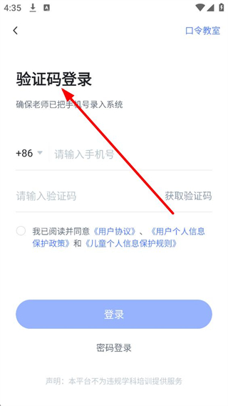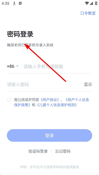1、進入密碼登錄界面,輸入手機號或郵箱、密碼,勾選協議后點擊登錄,即可進入平臺使用教育服務,確保老師已將手機號錄入系統。