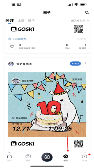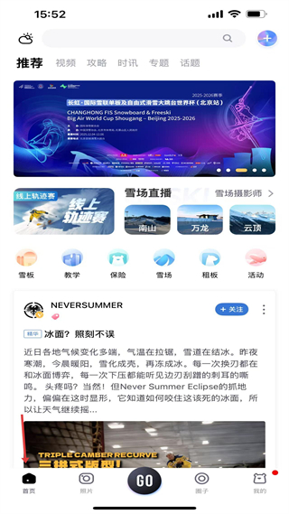 4、進去圈子,展示雪友分享的滑雪動態與技巧,支持關注、互動及話題參與,是滑雪愛好者交流分享的社區板塊。
