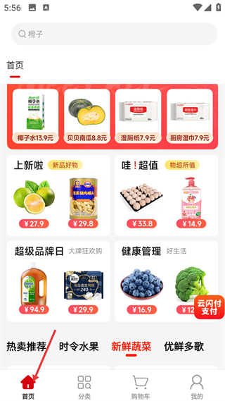 1、 首頁展示各類生鮮日用品,分多個板塊,支持商品搜索,是用戶瀏覽選購商品的綜合入口。