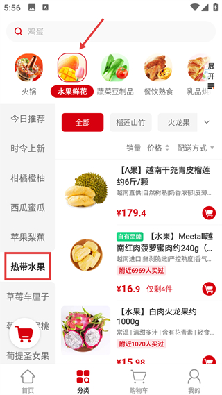 3、分類頁水果鮮花熱帶水果板塊展示榴蓮等商品,標注價格庫存,配加購按鈕,方便選購熱帶水果。