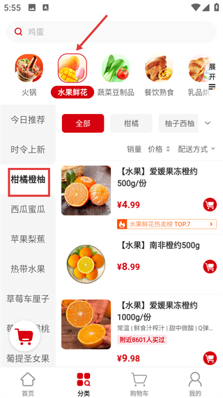 4、分類頁水果鮮花柑橘橙柚板塊呈現愛媛果凍橙等,顯示價格銷量,支持加購,滿足柑橘類水果購買需求。