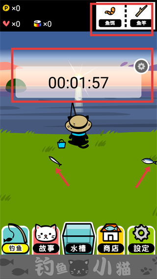 2、設定好時間后小貓開始釣魚,界面會顯示倒計時,同時要留意魚餌和魚竿狀態,等魚出現就有機會釣到。