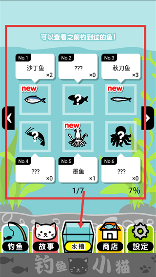 4、點擊水槽能查看之前釣到過的魚,像沙丁魚、秋刀魚、墨魚等,還能看到收集進度,激勵自己釣更多種類的魚。