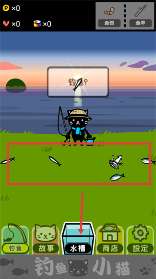 3、小貓釣到魚后,小魚們會掉落在草坪上,玩家可以通過點擊將魚放入水槽,這樣能收集不同的魚,豐富自己的魚類收藏。