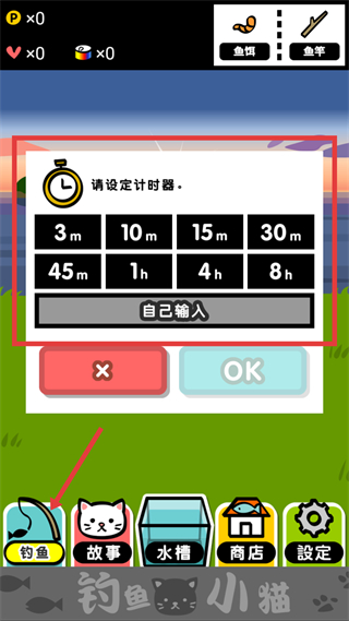 1、進入釣魚界面后,會彈出設定計時器的窗口,可選擇3分鐘、10分鐘等預設時長,也能自己輸入時間,選好后點OK開始釣魚。