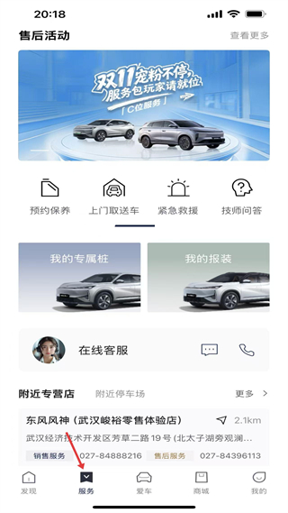 2、服務頁,提供預約保養、上門取送車等售后功能,展示附近專營店信息,底部服務是車主服務功能核心入口。