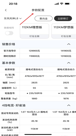 3、參數配置界面,對比東風風神L8兩款車型的價格、尺寸等參數,支持意向金支付與預訂,是車型信息查詢入口。