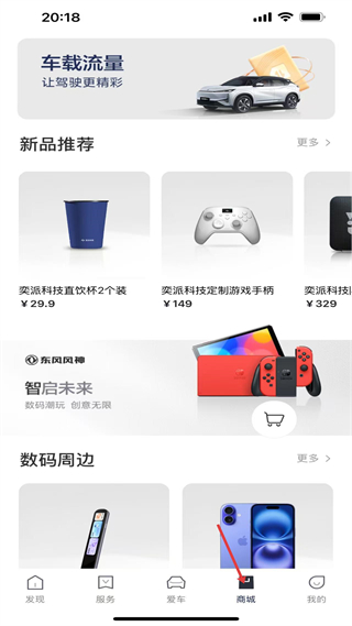 4、商城頁,售賣車載周邊與數碼產品,含直飲杯、游戲手柄等商品,底部商城是品牌周邊及數碼產品購物入口。