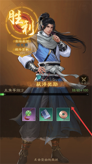 3、戰斗勝利后可獲得獎勵,如經驗、道具等,點擊空白處關閉勝利界面繼續游戲下一步操作。
