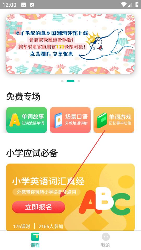 1、打開學為貴青少app,在小學應試必備區找到小學英語詞匯真經,點擊立即報名,進入課程詳情頁了解內容。