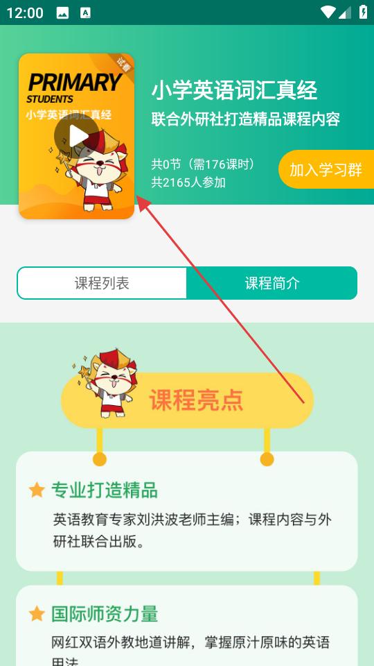 2、在課程詳情頁,查看課程亮點等信息,點擊課程封面進入,瀏覽課程列表,選擇想學習的課時,開啟英語詞匯學習之旅。