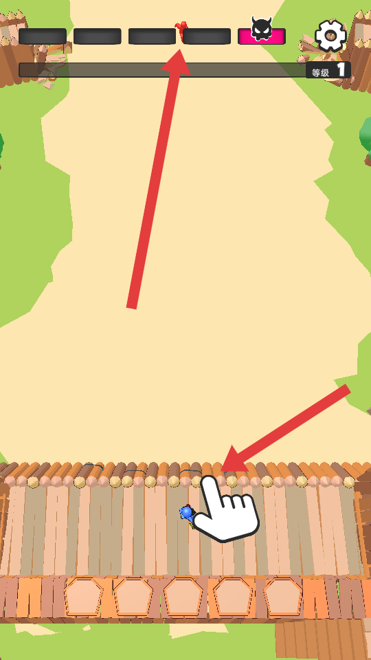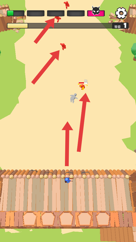 1、進入游戲,操控角色在場景里準備,上方有進度條和等級顯示,要守護防線,應對即將出現的敵人,開啟防御挑戰。