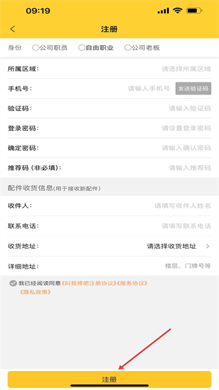 3、注冊頁需選擇身份、填寫所屬區域、手機號等信息,還需完善配件收貨信息,注冊前需同意相關協議。