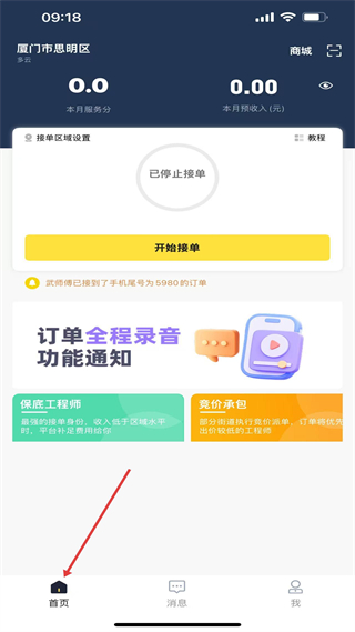 4、首頁顯示所在區域、本月服務分和預收入,可設置接單區域,有開始接單按鈕,還介紹訂單錄音功能和不同服務模式。
