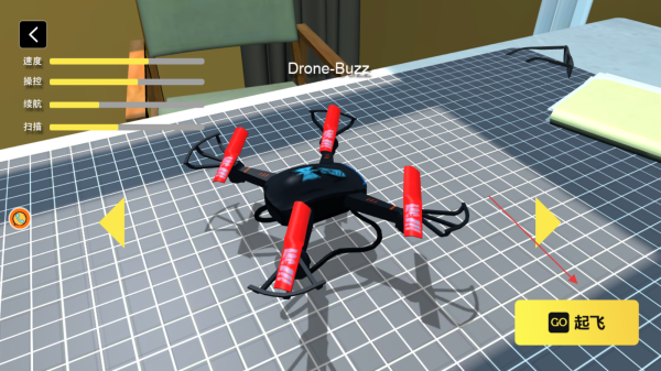 3、在無人機準備界面可調整速度、操控、續航、掃描等參數,調整完畢后,點擊起飛按鈕開啟任務挑戰。