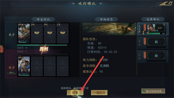 3、在攻打確認界面,可查看陣壘對比、部隊信息等,點擊行軍按鈕向土匪發起進攻。