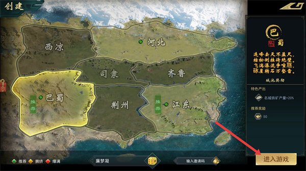 1、創建角色時可選擇巴蜀等區域,了解其特產獎勵等信息后,點擊進入游戲開啟征程。
