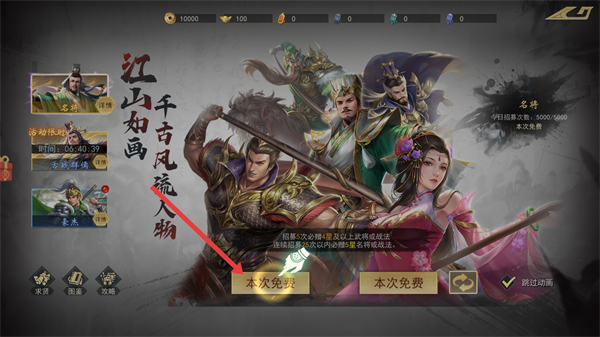 2、進入后有江山如畫的界面,可參與名將免費抽取活動,獲取有力武將助力游戲。