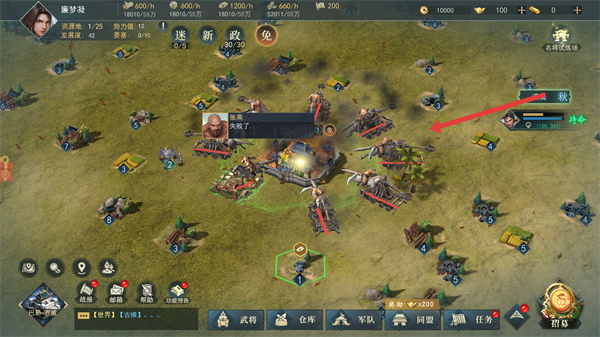 4、在大地圖場景,可進行招募等操作,參與城池攻打等玩法,發展勢力擴張領地。