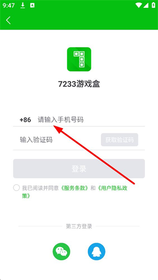 3、登錄頁面需輸入手機號碼、驗證碼,登錄前要勾選同意服務條款和用戶隱私政策,也可選擇微信、QQ等第三方登錄方式,完成登錄后可使用游戲盒更多功能。