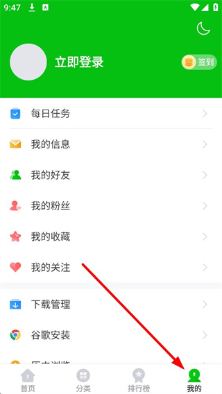 2、點擊我的進入個人頁面,可看到立即登錄入口,還有每日任務、我的信息、我的好友等功能選項,點擊登錄可進行賬號登錄操作,享受更多個性化服務。