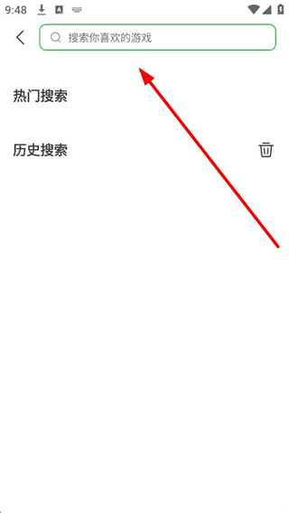 4、游戲搜索頁面,頂部搜索欄可輸入喜歡的游戲名稱,下方有熱門搜索和歷史搜索板塊,方便用戶快速找到想要的游戲,滿足游戲查找需求。
