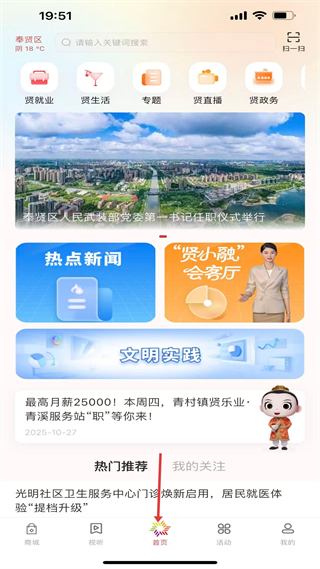 1、首頁顯示天氣,有搜索欄和賢就業等服務入口,推送武裝部任職儀式、招聘等新聞,還有熱門推薦板塊。