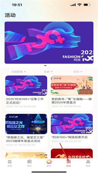 2、活動界面展示時尚100征集、融媒盤點等活動,可按距離、時間篩選,方便用戶參與本地各類活動。