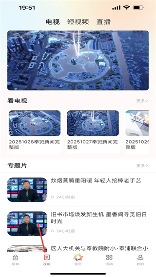 3、視聽界面,有電視、短視頻、直播分類,提供奉賢新聞完整版、專題片等視聽內容,涵蓋本地新聞和文化專題。