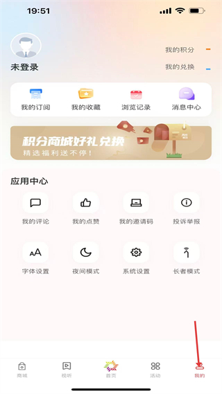 4、我的界面,顯示未登錄狀態,有我的訂閱、收藏等功能入口,還有積分商城兌換和應用中心的各類設置選項。