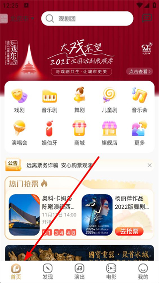 1、進入首頁可選擇城市,搜索演出相關關鍵詞,查看戲劇、音樂劇、舞劇等演出分類,還有熱門搶票活動,可了解演出信息并購票。