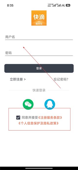 1、打開快滴順風車,點同意服務條款,進入登錄頁,輸用戶名密碼,勾選協議,完成登錄,使用叫車功能。