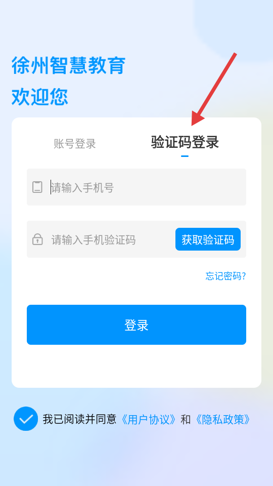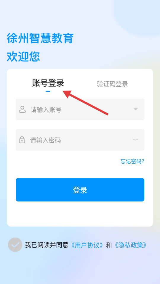 1、點擊徐州智慧教育登錄頁,以徐州智慧教育歡迎您開場,提供賬號登錄方式,需輸入賬號、密碼,下方有隱私協議選項。