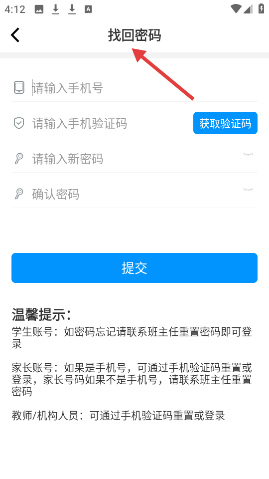 3、點擊找回密碼頁面可通過手機號及驗證碼重置密碼,下方有對學生、家長、教師機構人員不同身份的密碼找回溫馨提示。