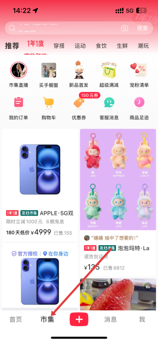 1、打開購物類應用,進入首頁,能看到各類商品推薦、市集等入口,還有我的訂單、購物車等功能,點擊感興趣的商品。