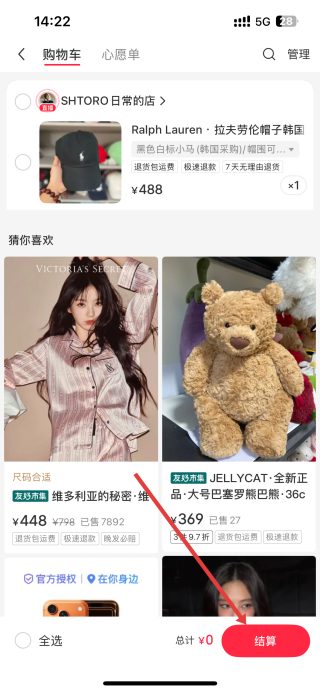 4、進入購物車頁面,可查看已加入的商品,確認要購買的商品后,點擊結算,進行后續的支付等購物流程。