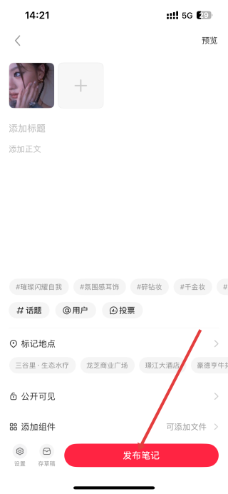 3、創作內容時,可添加圖片、標題、正文,還能添加話題、標記地點等,設置好后點擊發布筆記,分享內容。