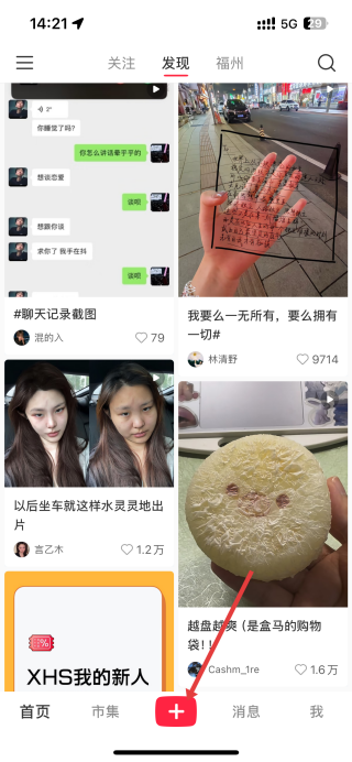 1、打開小紅書,進入發現頁面,能看到各類推薦內容,點擊下方加號,可開始創作內容。