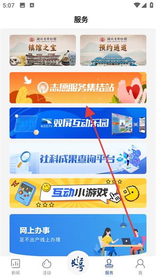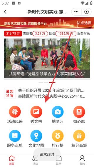1、進入軟件服務頁面點擊志愿服務集結站,進入新時代文明實踐志愿服務平臺,了解志愿者、隊伍等服務數據,開啟志愿服務參與體驗。