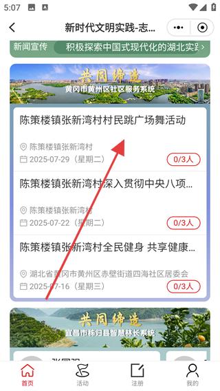 2、在志愿服務平臺瀏覽活動風采、秀文明等功能板塊,選擇活動板塊,查看陳策樓鎮張新灣村村民跳廣場舞活動等志愿活動,了解活動詳情與報名需求。
