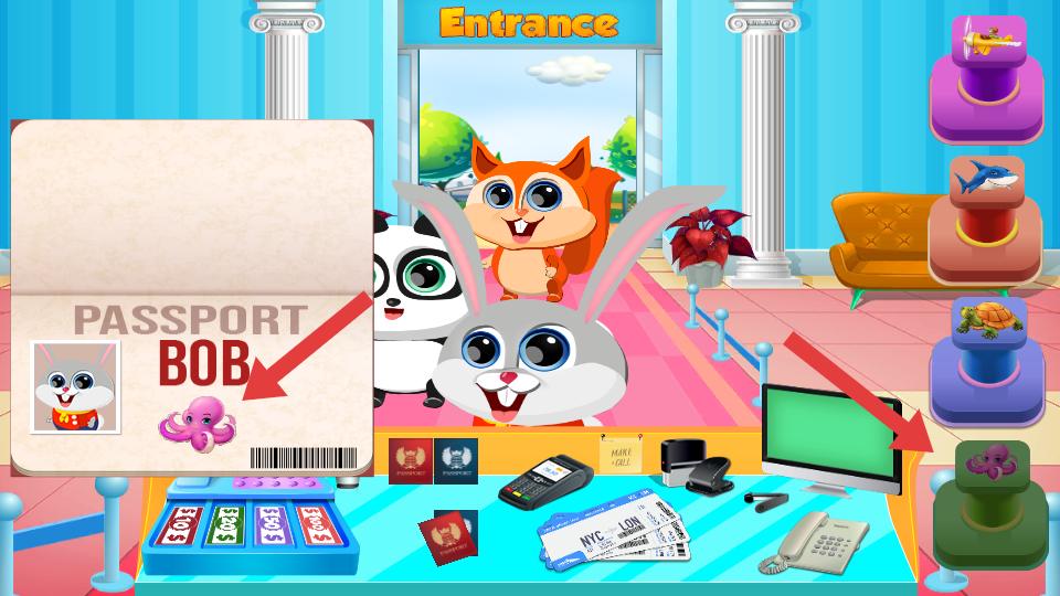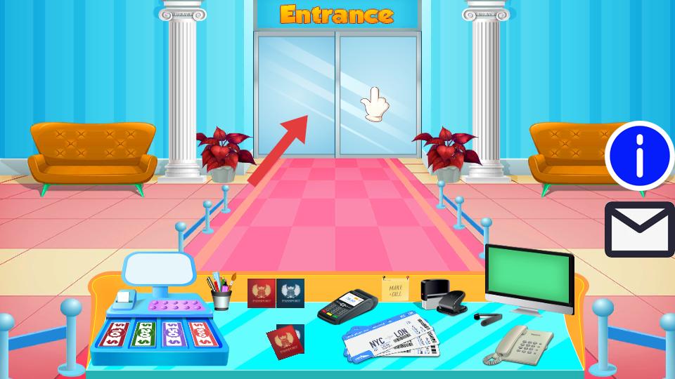 3、在機場入口場景,有柜臺和各種物品,按照提示,可進行相關操作,為后續的機場管理工作做好準備。
