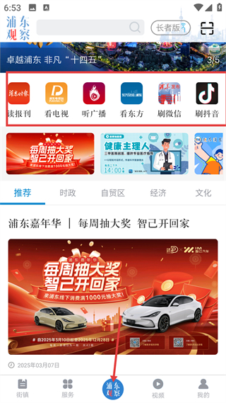 1、首頁整合讀報刊、看電視等功能入口,分類展示推薦資訊,是獲取浦東區域信息的綜合啟動頁面。