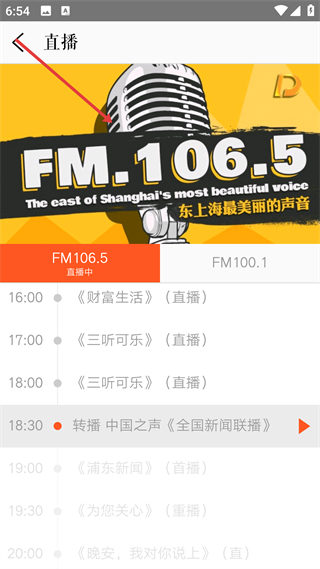3、廣播直播頁面展示FM106.5等頻率的節目表,實時播出廣播內容,是收聽區域廣播節目的核心入口。