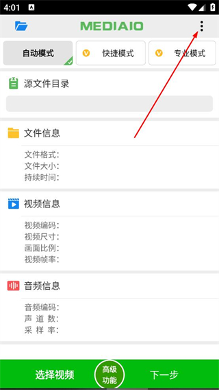 1、打開軟件進入主界面,可看到自動模式快捷模式等選項,點擊右上角三點圖標,展開功能菜單,準備選擇所需功能選項。